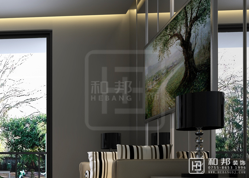 整體上看一切從簡設計,以簡約功能化為主,注重空間結構布局,但是沙發后面的那副畫又給整個空間添加了色彩,這種設計充分體現了簡約風格中又不失色彩感。