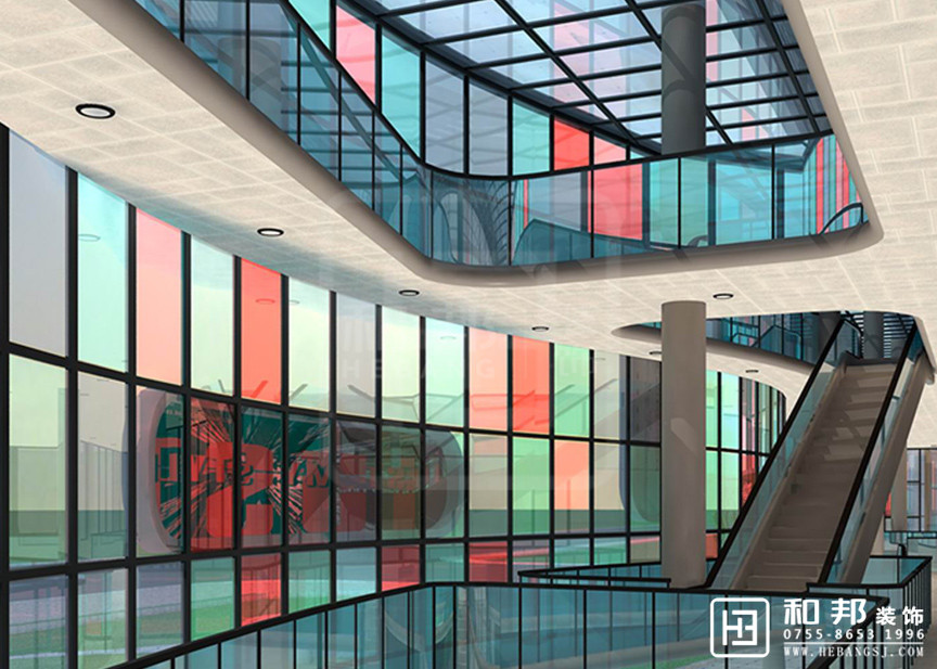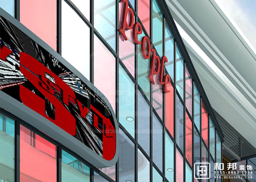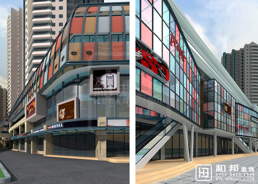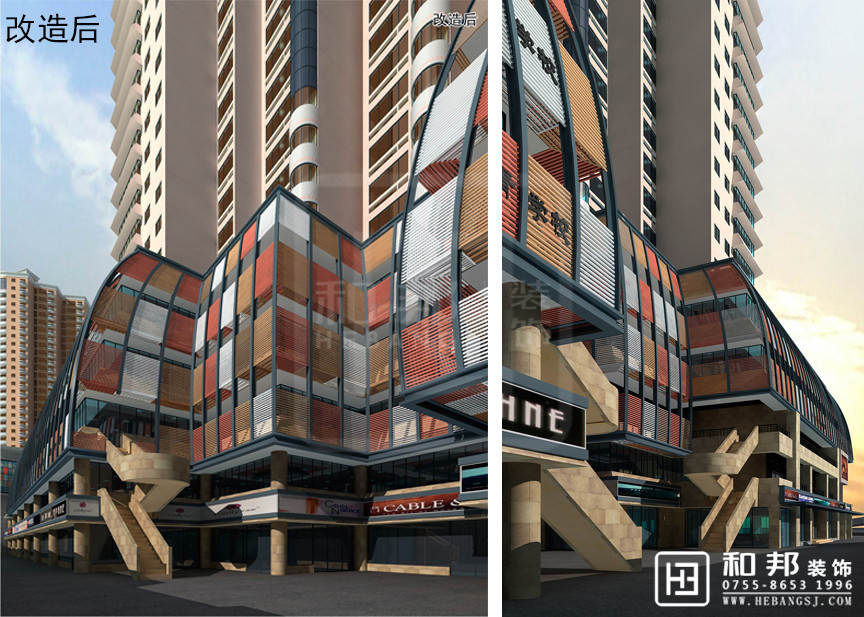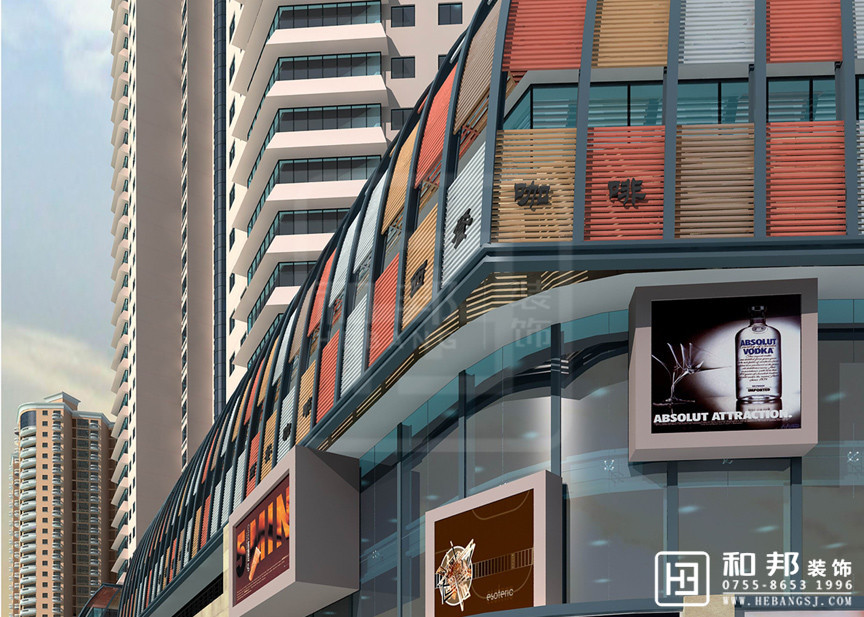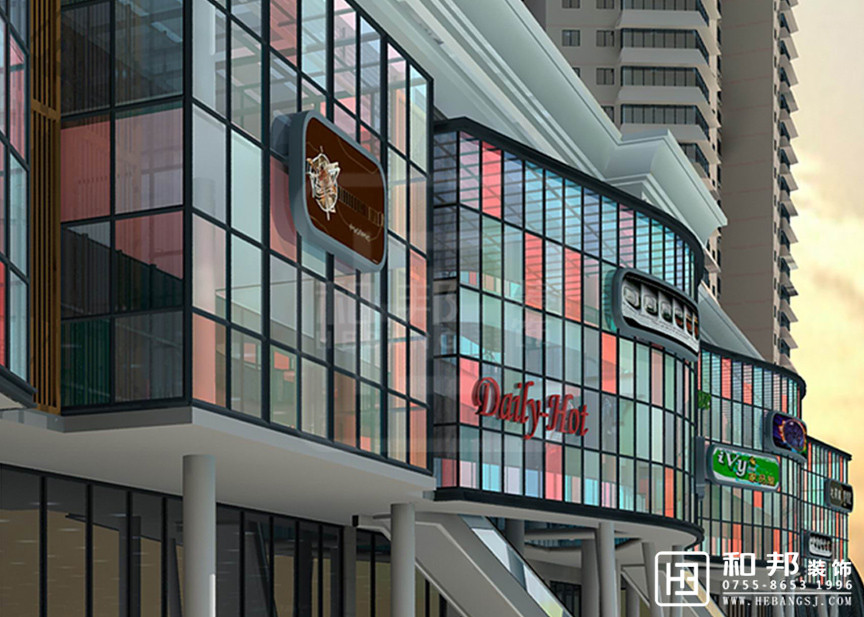 本設計樓下商業區外觀使用了幾種顏色的拼接了起來,給整個空間添加了色彩感。