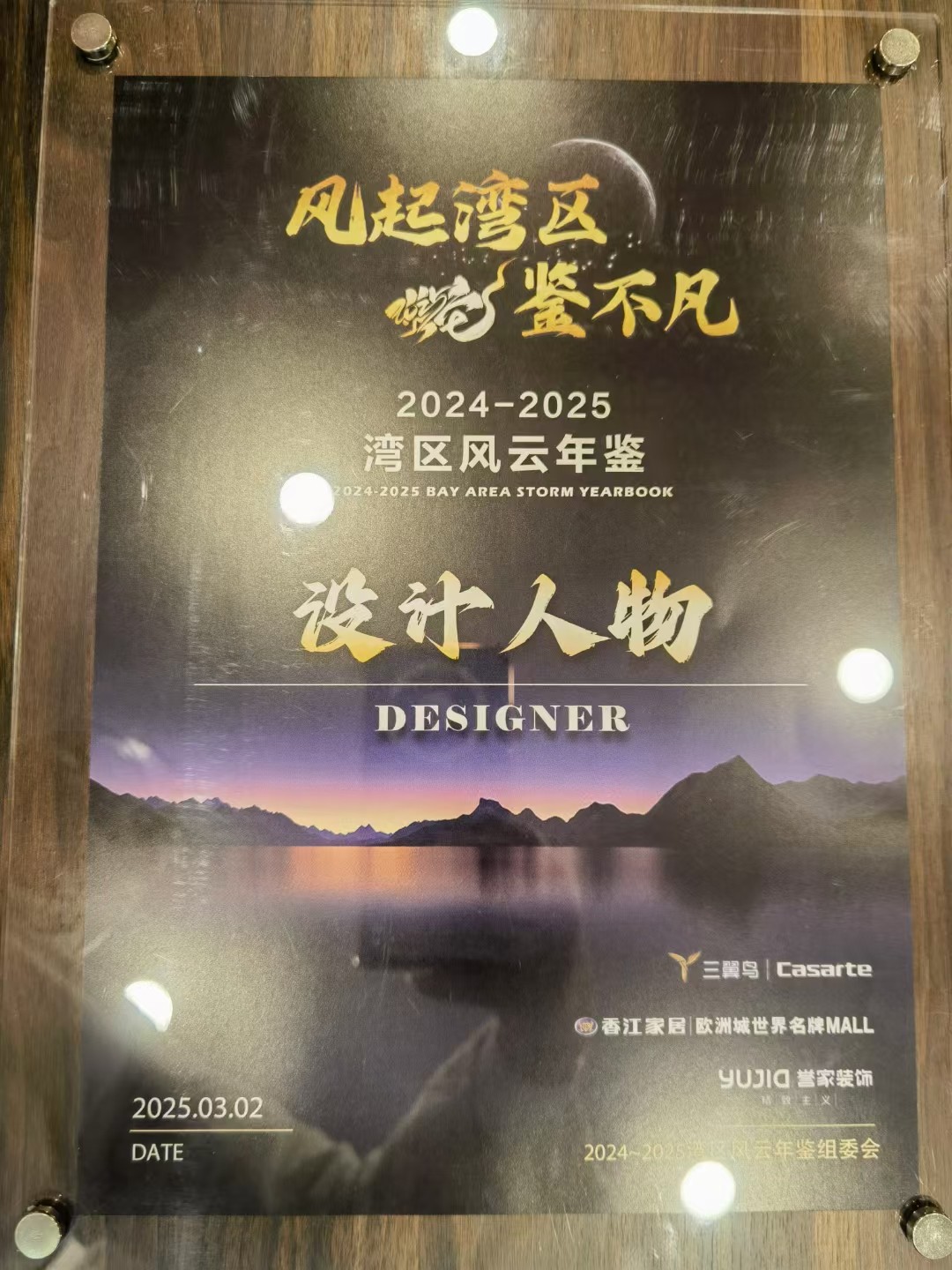 2025 年 3 月 2 日,【風起灣區,鑒不凡】2024-2025 年灣區設計風云年鑒系列活動在深圳盛大啟幕,和邦裝飾創始人劉擁軍受邀出席,憑借在設計領域的深厚積淀與突出貢獻,一舉斬獲 “年鑒人物” 與 “設計人物” 雙項榮譽稱號,成為現場焦點。